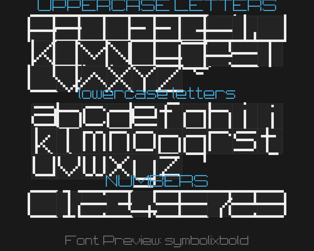 00symbolixbold is a font file with a size of 0.02 MB. The full font name is 00SymbolixBold, 1.00 version. It contains 225 characters, supports 8 Chinese characters. The copyright belongs to 00Symbolix. 00symbolixbold font is available for free download, but commercial use requires confirmation on the 00Symbolix official website whether it's free for commercial use.