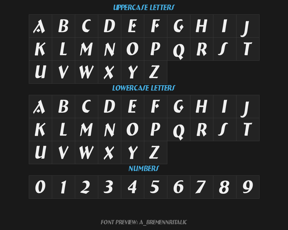 a_bremennritalic is a font file with a size of 0.05 MB. The full font name is a_BremenNr Italic, 01.02 version. It contains 193 characters, supports 8 Chinese characters. The copyright belongs to a_BremenNr. a_bremennritalic font is available for free download, but commercial use requires confirmation on the a_BremenNr official website whether it's free for commercial use.