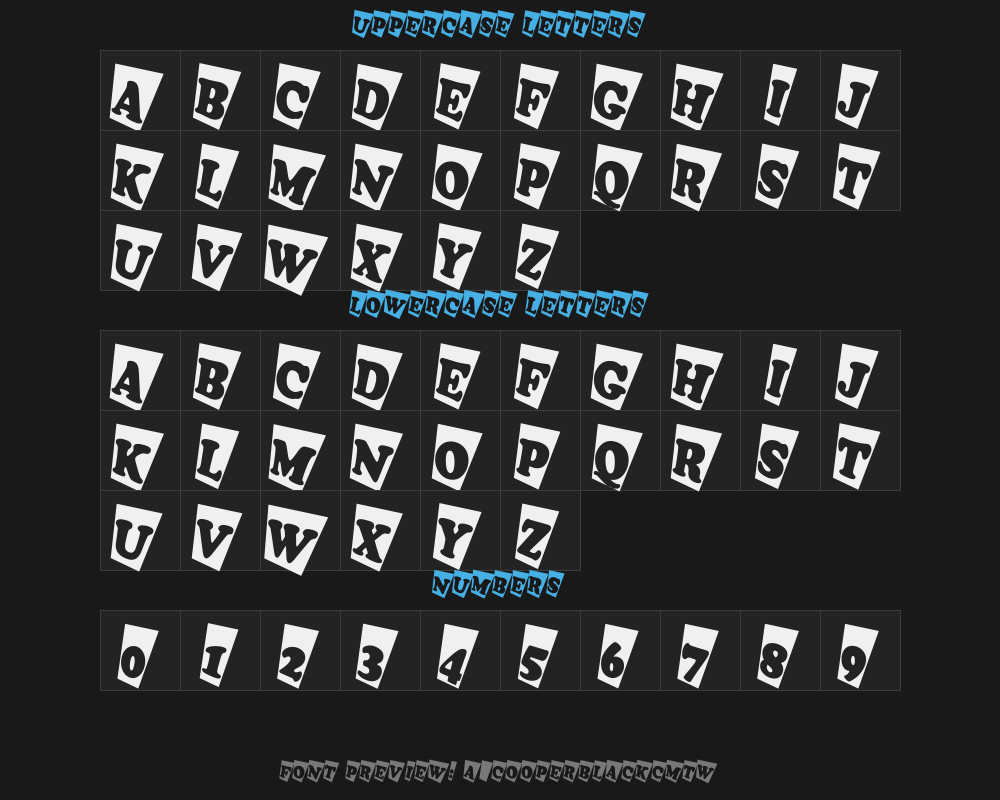 a_cooperblackcmtw is a font file with a size of 0.04 MB. The full font name is a_CooperBlackCmTw, 01.03 version. It contains 193 characters, supports 8 Chinese characters. The copyright belongs to a_CooperBlackCmTw. a_cooperblackcmtw font is available for free download, but commercial use requires confirmation on the a_CooperBlackCmTw official website whether it's free for commercial use.