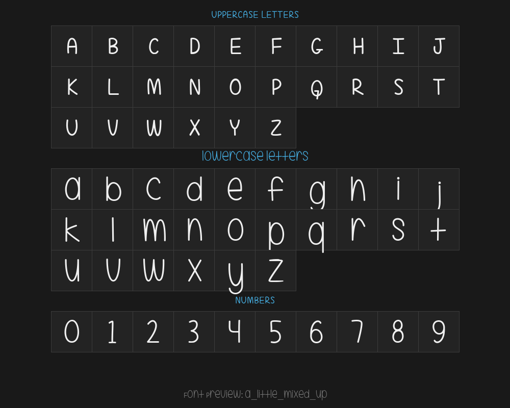 | Font company | A Little Mixed Up is a trademark of Misti's Fonts (Misti Hammers). |
