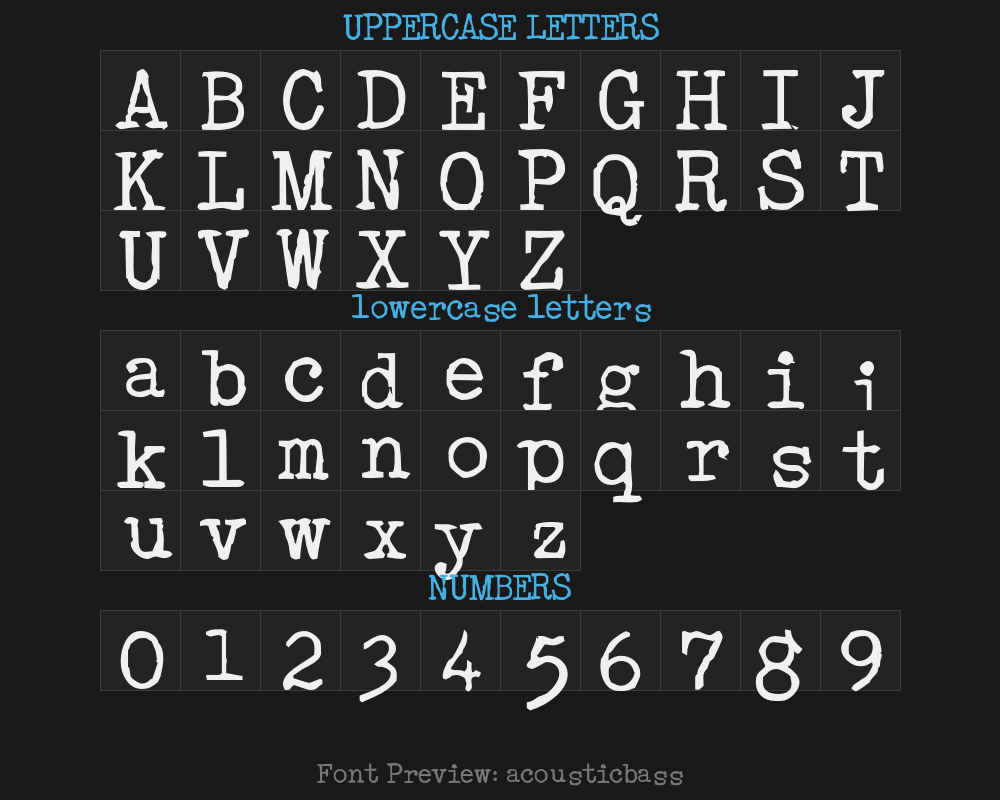 acousticbass is a font file with a size of 0.02 MB. The full font name is AcousticBass, 001.000 version. It contains 85 characters, supports 8 Chinese characters. The copyright belongs to AcousticBass. acousticbass font is available for free download, but commercial use requires confirmation on the AcousticBass official website whether it's free for commercial use.