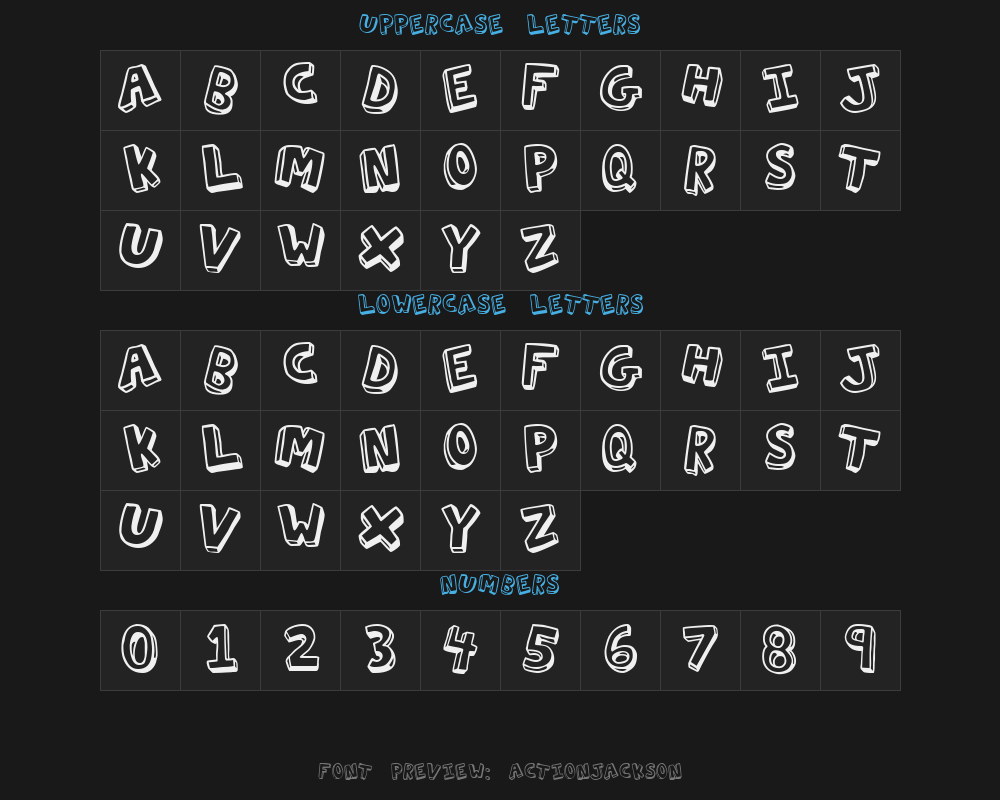 actionjackson is a font file with a size of 0.03 MB. The full font name is Action Jackson, Frog 8 23 98 1.0 version. It contains 105 characters, supports 8 Chinese characters. The copyright belongs to Action Jackson. actionjackson font is available for free download, but commercial use requires confirmation on the Action Jackson official website whether it's free for commercial use.
