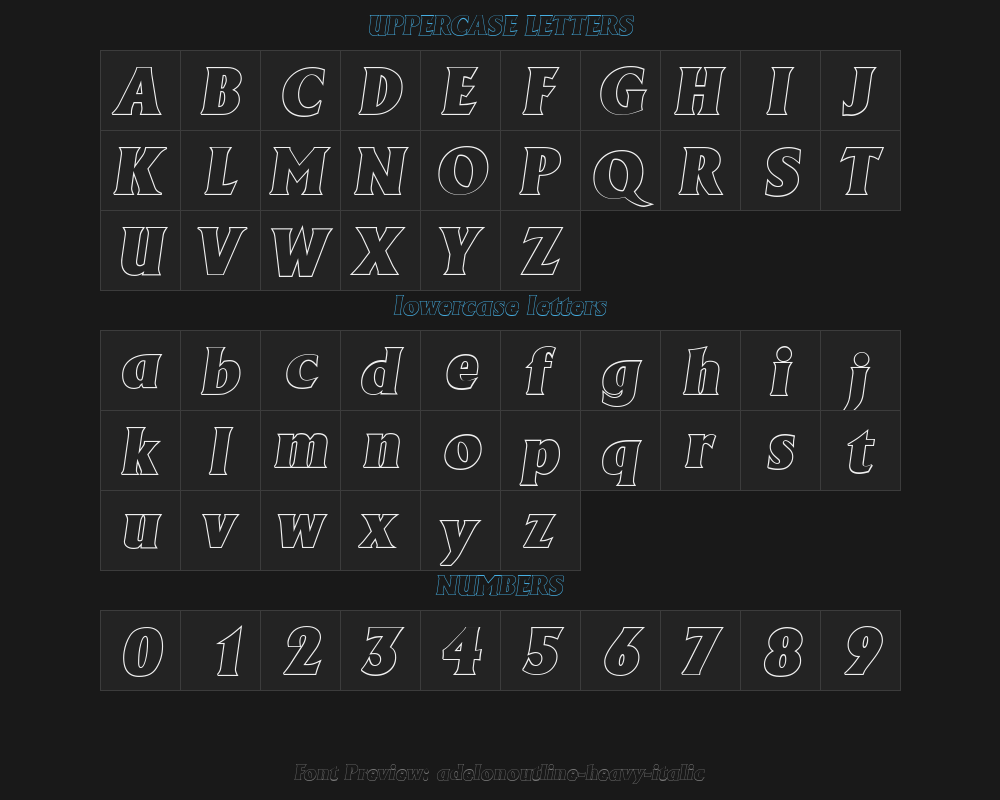 adelonoutline-heavy-italic is a font file with a size of 0.09 MB. The full font name is AdelonOutline-Heavy-Italic, Version 1.0 27-08-2002 version. It contains 239 characters, supports 8 Chinese characters. The copyright belongs to AdelonOutline-Heavy. adelonoutline-heavy-italic font is available for free download, but commercial use requires confirmation on the AdelonOutline-Heavy official website whether it's free for commercial use.