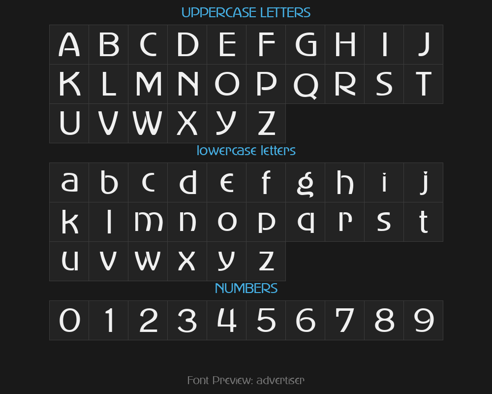 advertiser is a font file with a size of 0.03 MB. The full font name is Advertiser, Macromedia Fontographer 4.1 3 12 97 version. It contains 193 characters, supports 8 Chinese characters. The copyright belongs to Advertiser. advertiser font is available for free download, but commercial use requires confirmation on the Advertiser official website whether it's free for commercial use.