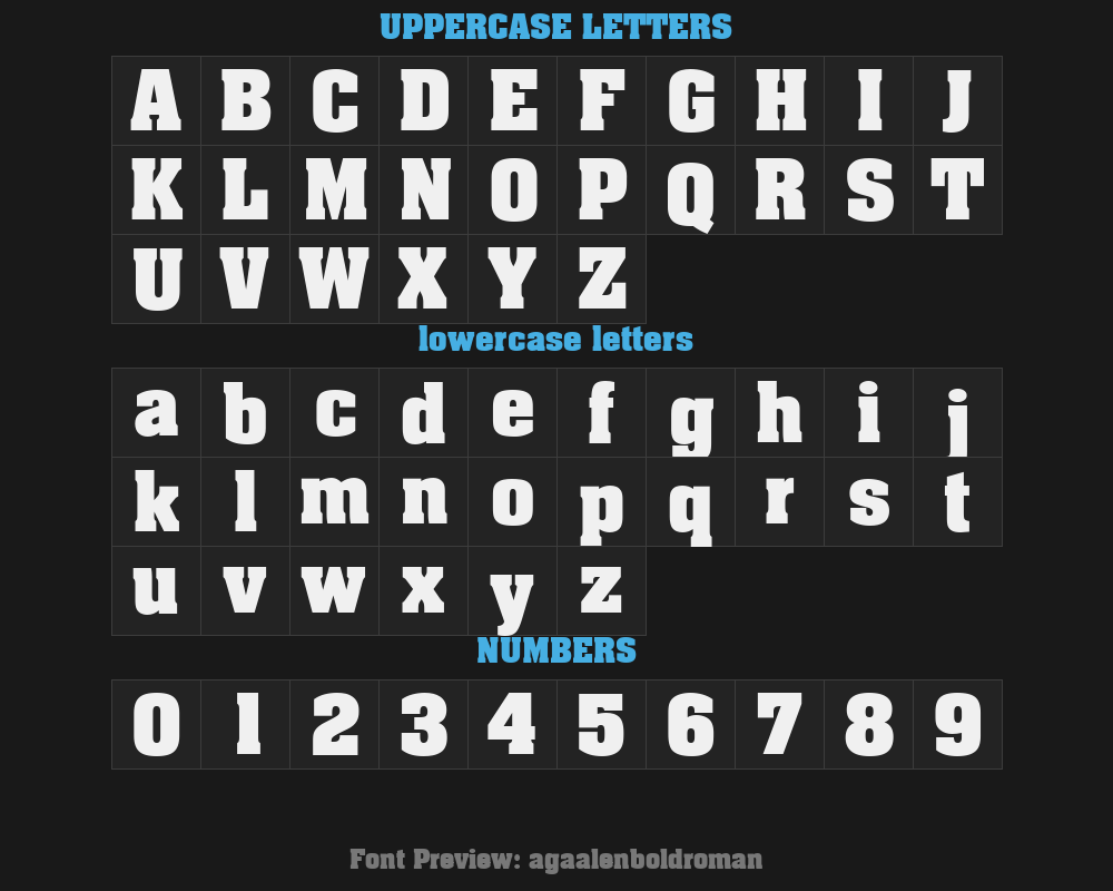 agaalenboldroman is a font file with a size of 0.05 MB. The full font name is AGAalenBold Roman, 1.0 Tue Mar 22 21 13 49 1994 version. It contains 264 characters, supports 8 Chinese characters. The copyright belongs to AGAalenBold. agaalenboldroman font is available for free download, but commercial use requires confirmation on the AGAalenBold official website whether it's free for commercial use.