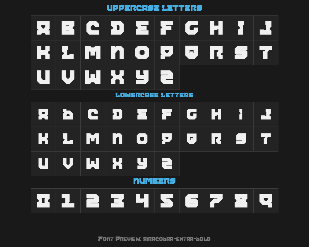 airacobra-extra-bold is a font file with a size of 0.03 MB. The full font name is Airacobra Extra Bold, 001.000 version. It contains 218 characters, supports 8 Chinese characters. The copyright belongs to Airacobra Extra Bold. airacobra-extra-bold font is available for free download, but commercial use requires confirmation on the Airacobra Extra Bold official website whether it's free for commercial use.