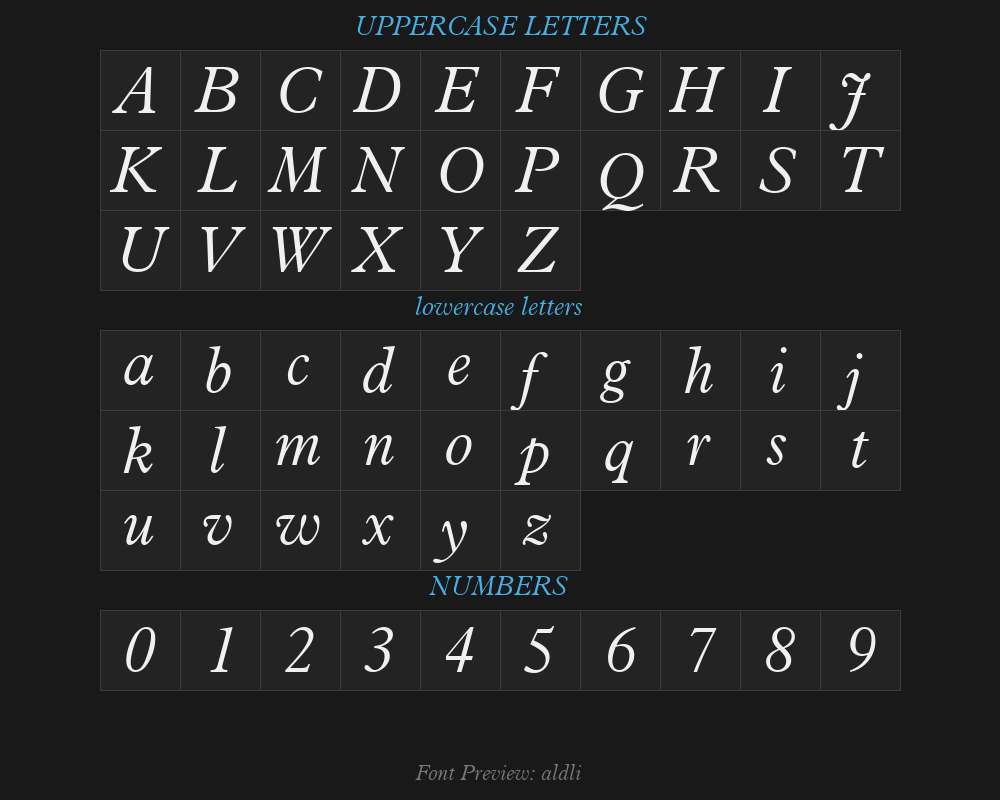 ald721li is a font file with a size of 0.05 MB. The full font name is Aldine 721 Light Italic BT, mfgpctt-v1.53 Monday, February 1, 1993 1 22 35 pm (EST) version. It contains 257 characters, supports 8 Chinese characters. The copyright belongs to Aldine721 Lt BT. ald721li font is available for free download, but commercial use requires confirmation on the Aldine721 Lt BT official website whether it's free for commercial use.
