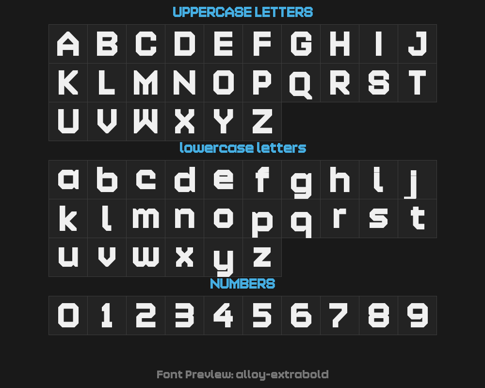 alloy-extrabold is a font file with a size of 0.02 MB. The full font name is Alloy ExtraBold, Version 1.00 version. It contains 251 characters, supports 8 Chinese characters. The copyright belongs to Alloy. alloy-extrabold font is available for free download, but commercial use requires confirmation on the Alloy official website whether it's free for commercial use.