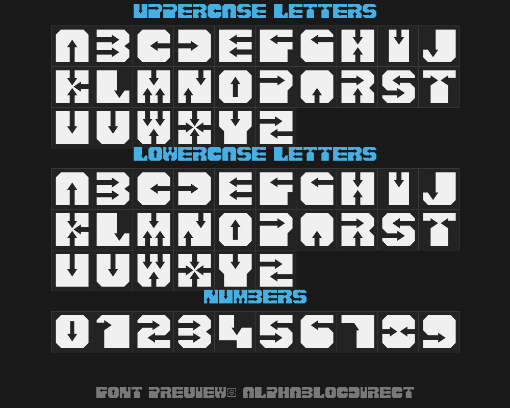 alphablocdirect is a font file with a size of 0.11 MB. The full font name is AlphaBloc-Direct, Version 001.000 version. It contains 217 characters, supports 8 Chinese characters. The copyright belongs to AlphaBloc. alphablocdirect font is available for free download, but commercial use requires confirmation on the AlphaBloc official website whether it's free for commercial use.