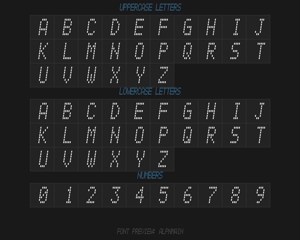 alpnmain is a font file with a size of 0.03 MB. The full font name is Alpine 7558M, 1.0 Tue May 20 21 57 17 1997 version. It contains 128 characters, supports 8 Chinese characters. The copyright belongs to Alpine 7558M. alpnmain font is available for free download, but commercial use requires confirmation on the Alpine 7558M official website whether it's free for commercial use.
