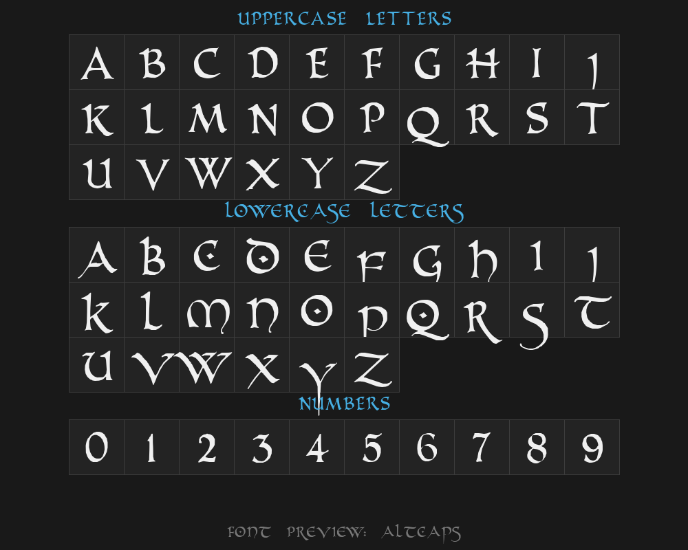 altcaps is a font file with a size of 0.04 MB. The full font name is PR Uncial Alt Caps, 1.0 Sun Jun 21 13 42 18 1998 version. It contains 118 characters, supports 8 Chinese characters. The copyright belongs to PR Uncial Alt Caps. altcaps font is available for free download, but commercial use requires confirmation on the PR Uncial Alt Caps official website whether it's free for commercial use.