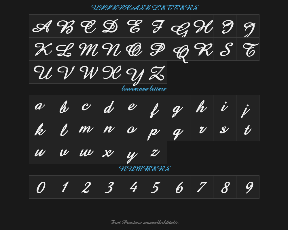 amazedbolditalic is a font file with a size of 0.09 MB. The full font name is Amaze D Bold Italic, 1.0 Tue Jul 27 12 53 41 1993 version. It contains 203 characters, supports 8 Chinese characters. The copyright belongs to Amaze D. amazedbolditalic font is available for free download, but commercial use requires confirmation on the Amaze D official website whether it's free for commercial use.