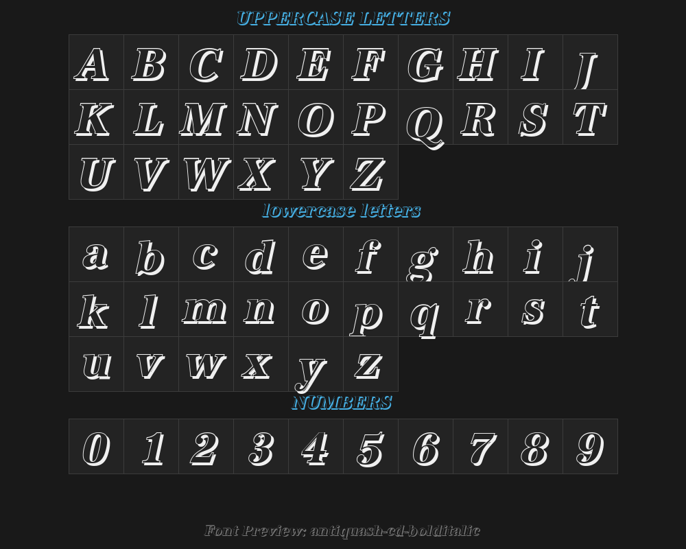 antiquash-cd-bolditalic is a font file with a size of 0.13 MB. The full font name is AntiquaSh-Cd-BoldItalic, Version 1.0 22-08-2002 version. It contains 239 characters, supports 8 Chinese characters. The copyright belongs to AntiquaSh-Cd. antiquash-cd-bolditalic font is available for free download, but commercial use requires confirmation on the AntiquaSh-Cd official website whether it's free for commercial use.
