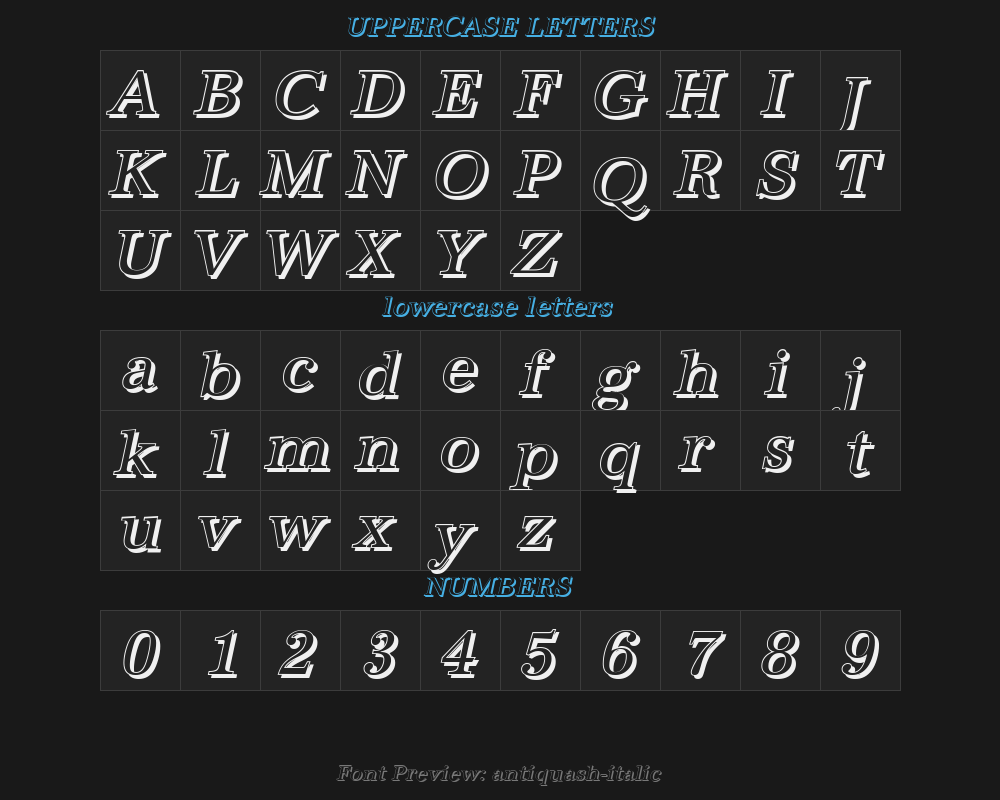 antiquash-italic is a font file with a size of 0.13 MB. The full font name is AntiquaSh-Italic, Version 1.0 22-08-2002 version. It contains 239 characters, supports 8 Chinese characters. The copyright belongs to AntiquaSh. antiquash-italic font is available for free download, but commercial use requires confirmation on the AntiquaSh official website whether it's free for commercial use.