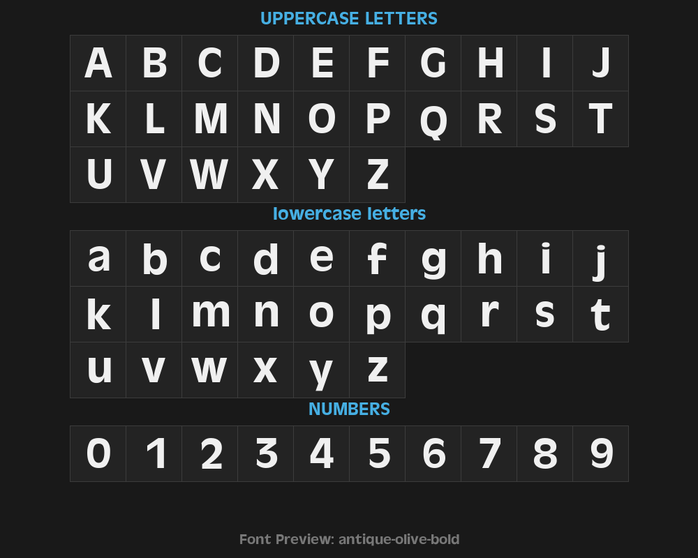 antique olive bold is a font file with a size of 0.04 MB. The full font name is Antique Olive Bold, 1.0 version. It contains 282 characters, supports 8 Chinese characters. The copyright belongs to Antique Olive. antique olive bold font is available for free download, but commercial use requires confirmation on the Antique Olive official website whether it's free for commercial use.