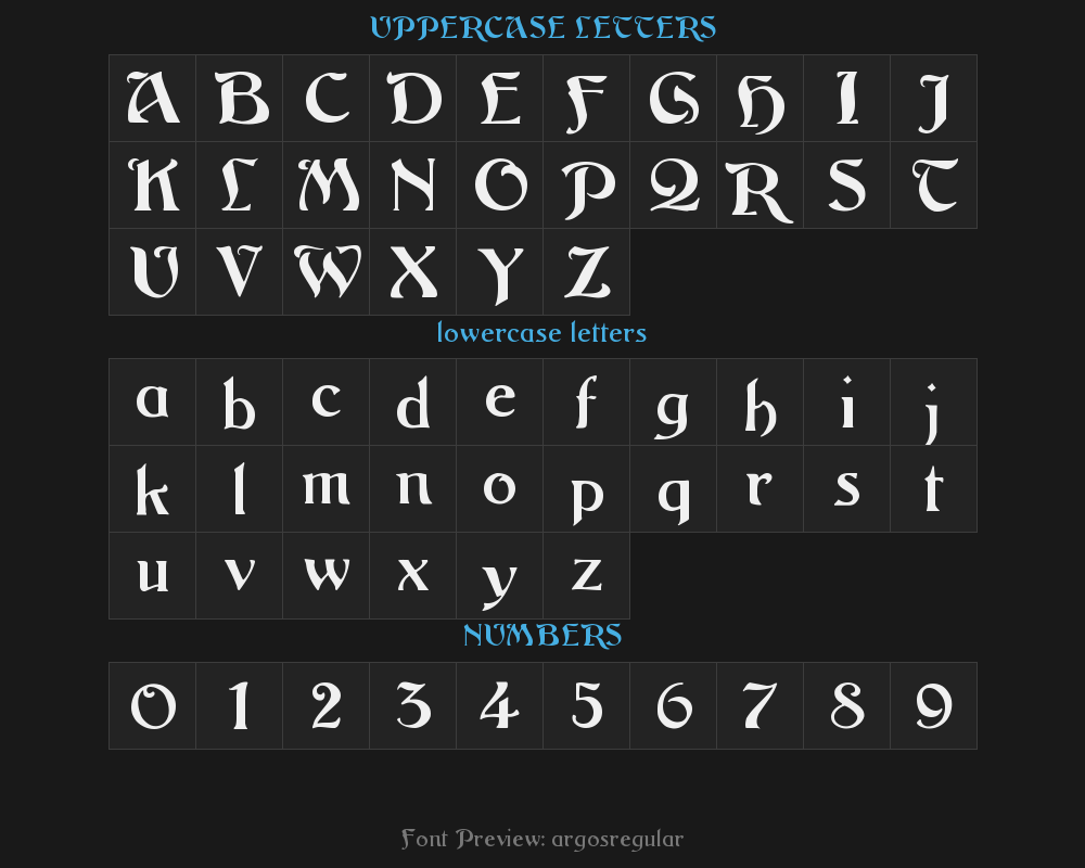 argosregular is a font file with a size of 0.03 MB. The full font name is Argos Regular, Altsys Fontographer 3.5 2 5 93 version. It contains 210 characters, supports 8 Chinese characters. The copyright belongs to Argos. argosregular font is available for free download, but commercial use requires confirmation on the Argos official website whether it's free for commercial use.
