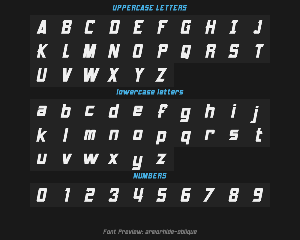 armorhide-oblique is a font file with a size of 0.02 MB. The full font name is Armorhide Oblique, Version 1.00 January 8, 2013, initial release version. It contains 240 characters, supports 8 Chinese characters. The copyright belongs to Armorhide Oblique. armorhide-oblique font is available for free download, but commercial use requires confirmation on the Armorhide Oblique official website whether it's free for commercial use.