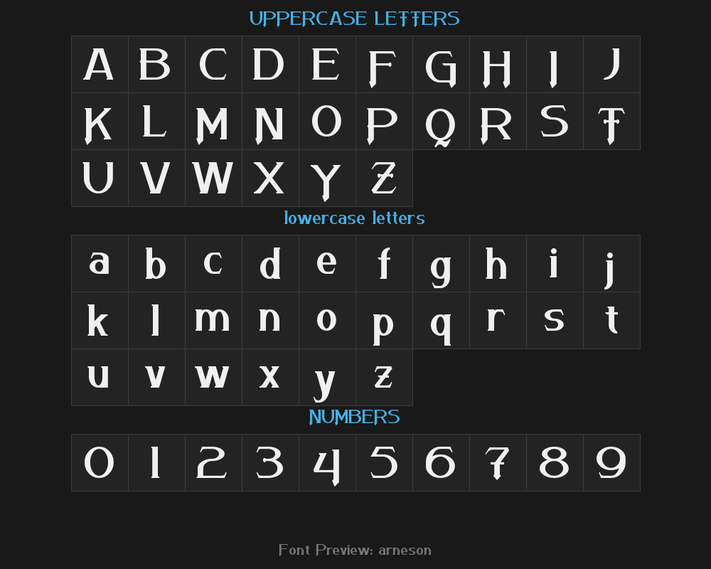 arneson is a font file with a size of 0.03 MB. The full font name is Arneson, Version 1.10 - May 19, 2013 version. It contains 240 characters, supports 8 Chinese characters. The copyright belongs to Arneson. arneson font is available for free download, but commercial use requires confirmation on the Arneson official website whether it's free for commercial use.