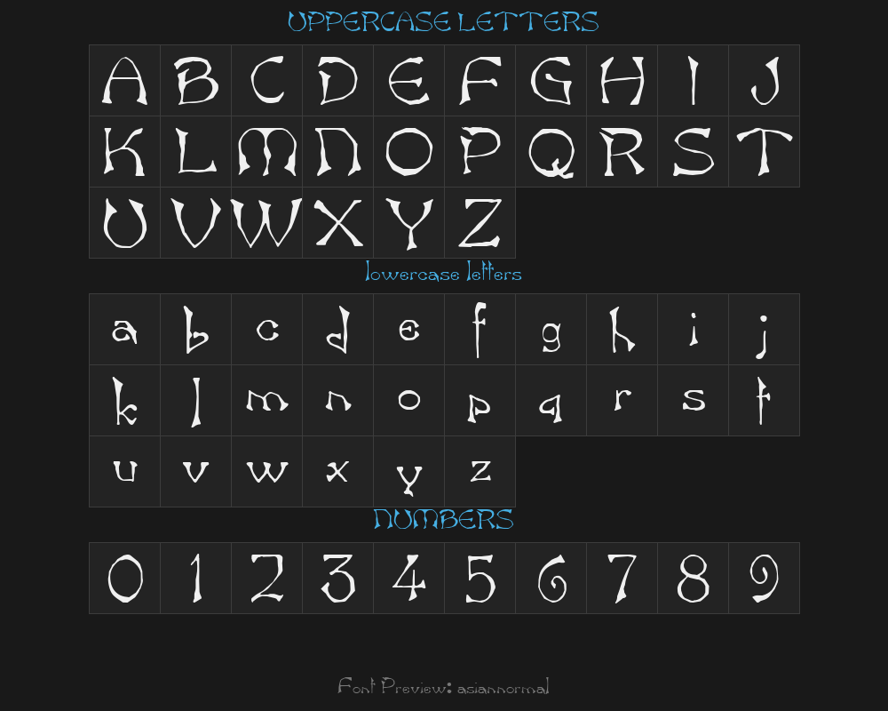 asiannormal is a font file with a size of 0.08 MB. The full font name is Asian Normal, Altsys Fontographer 4.1 5 24 96 version. It contains 220 characters, supports 8 Chinese characters. The copyright belongs to Asian. asiannormal font is available for free download, but commercial use requires confirmation on the Asian official website whether it's free for commercial use.