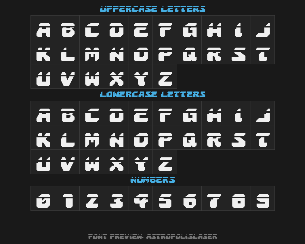 astropolislaser is a font file with a size of 0.04 MB. The full font name is Astropolis Laser, 001.000 version. It contains 219 characters, supports 8 Chinese characters. The copyright belongs to Astropolis Laser. astropolislaser font is available for free download, but commercial use requires confirmation on the Astropolis Laser official website whether it's free for commercial use.