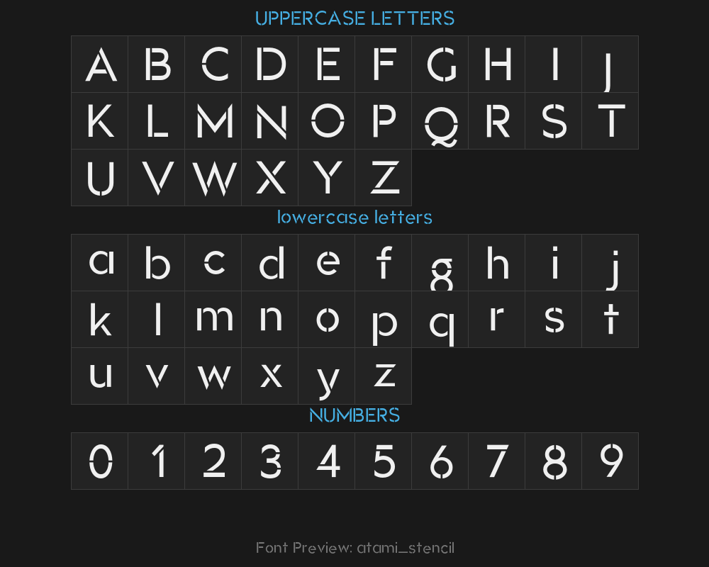 atami_stencil is a font file with a size of 0.02 MB. The full font name is Atami Stencil, Version 1.000;PS 001.000;hotconv 1.0.70;makeotf.lib2.5.58329 version. It contains 180 characters, supports 8 Chinese characters. The copyright belongs to Atami Stencil. atami_stencil font is available for free download, but commercial use requires confirmation on the Atami Stencil official website whether it's free for commercial use.