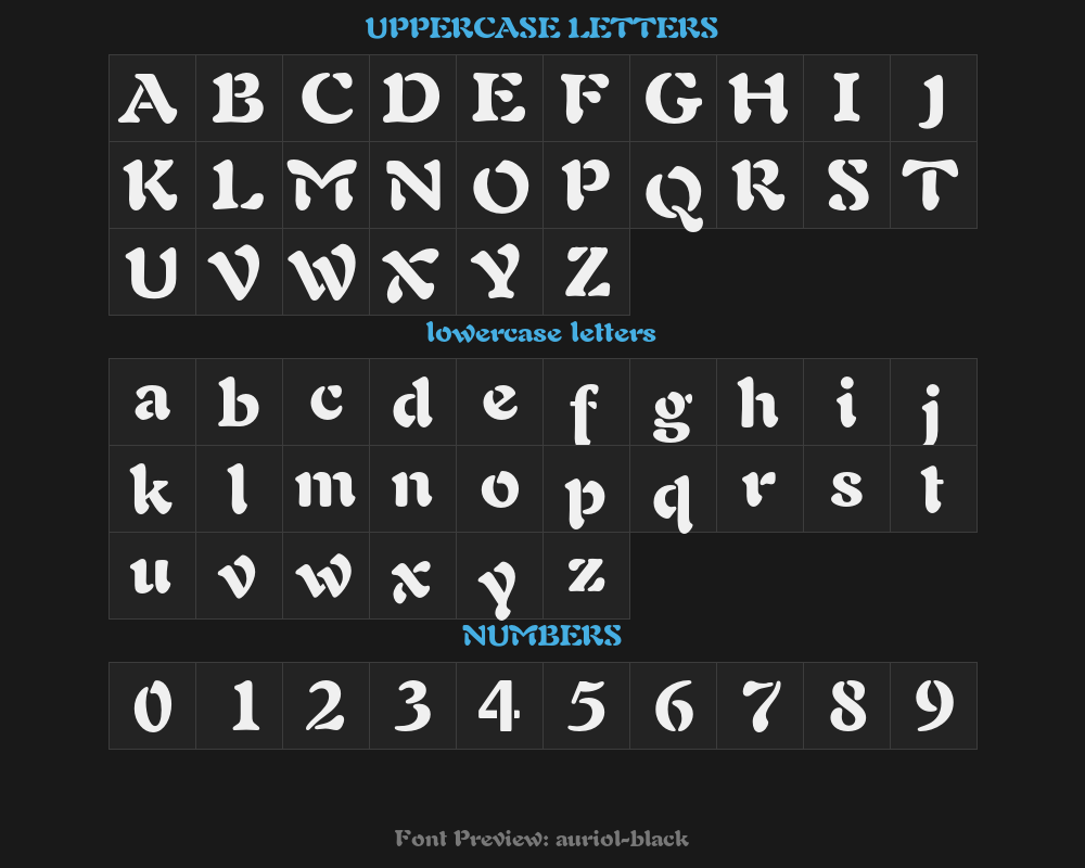 auriol-black is a font file with a size of 0.04 MB. The full font name is Auriol-Black, 001.001 version. It contains 228 characters, supports 8 Chinese characters. The copyright belongs to Auriol Black. auriol-black font is available for free download, but commercial use requires confirmation on the Auriol Black official website whether it's free for commercial use.