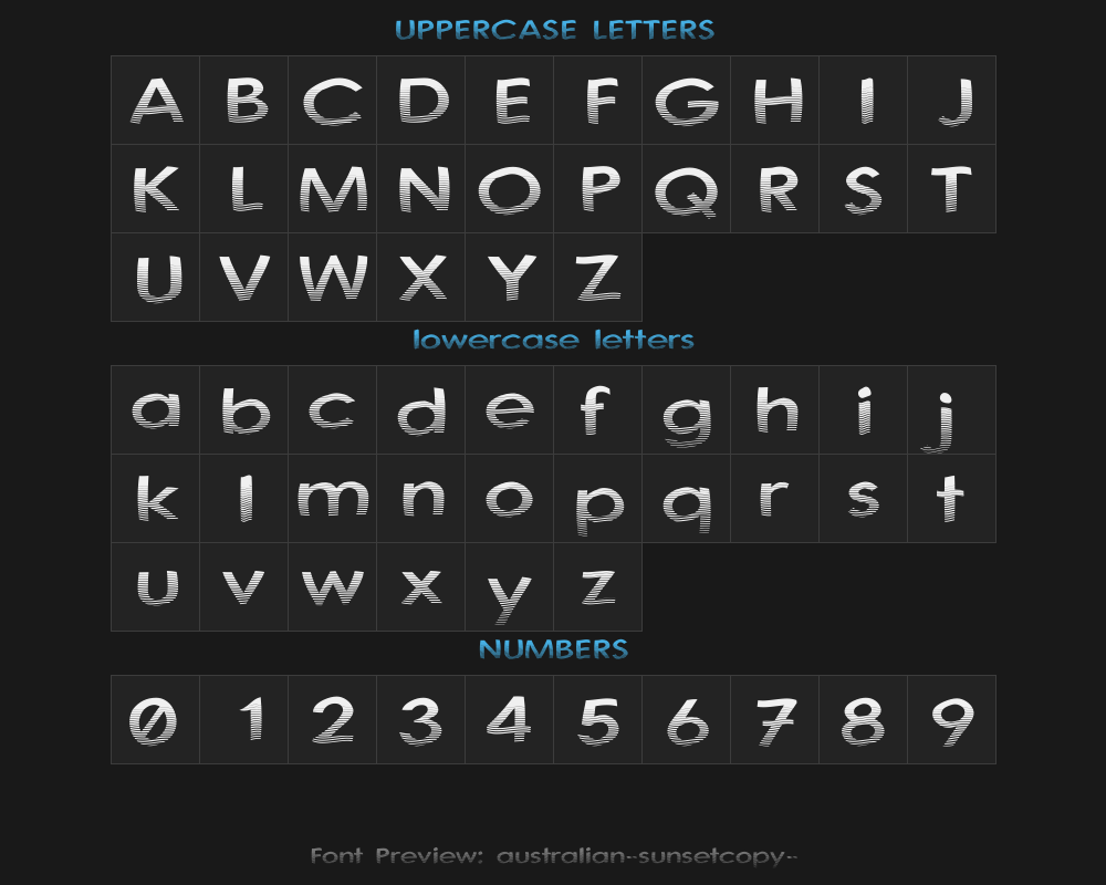 australian-sunsetcopy-1 is a font file with a size of 0.15 MB. The full font name is Australian Sunset, 2.00 (Corrected version with kerning) version. It contains 223 characters, supports 8 Chinese characters. The copyright belongs to Australian Sunset. australian-sunsetcopy-1 font is available for free download, but commercial use requires confirmation on the Australian Sunset official website whether it's free for commercial use.