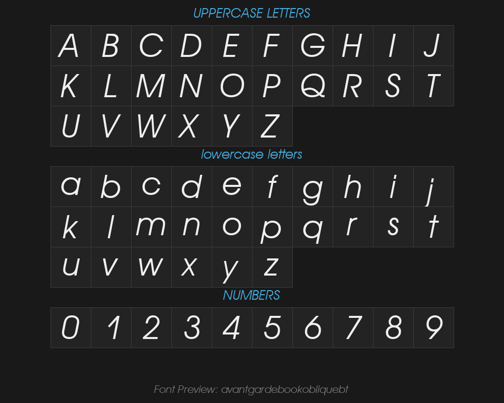 | PostScript name | AvantGardeITCbyBT-BookOblique |