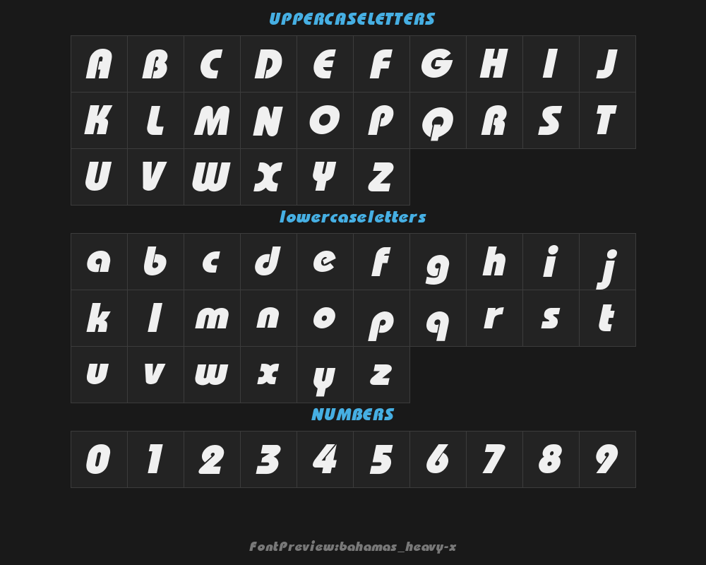 bahamas_heavy-x is a font file with a size of 0.04 MB. The full font name is Bahamas_Heavy-X, Converted from C WINDOWS PTF TTFONTS1 B&G00016.TF1 by ALLTYPE version. It contains 394 characters, supports 8 Chinese characters. The copyright belongs to Bahamas_Heavy-X. bahamas_heavy-x font is available for free download, but commercial use requires confirmation on the Bahamas_Heavy-X official website whether it's free for commercial use.