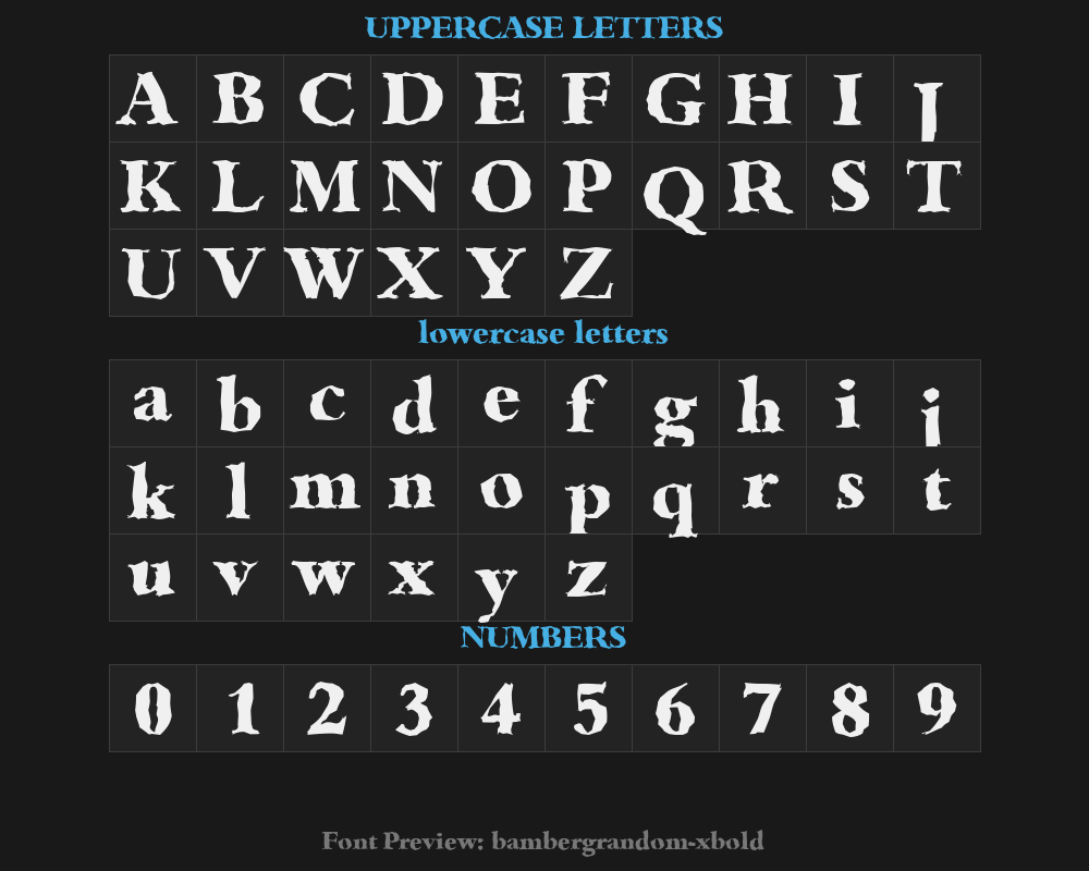 bambergrandom-xbold is a font file with a size of 0.09 MB. The full font name is BambergRandom-Xbold-Regular, Version 1.0 28-08-2002 version. It contains 229 characters, supports 8 Chinese characters. The copyright belongs to BambergRandom-Xbold. bambergrandom-xbold font is available for free download, but commercial use requires confirmation on the BambergRandom-Xbold official website whether it's free for commercial use.