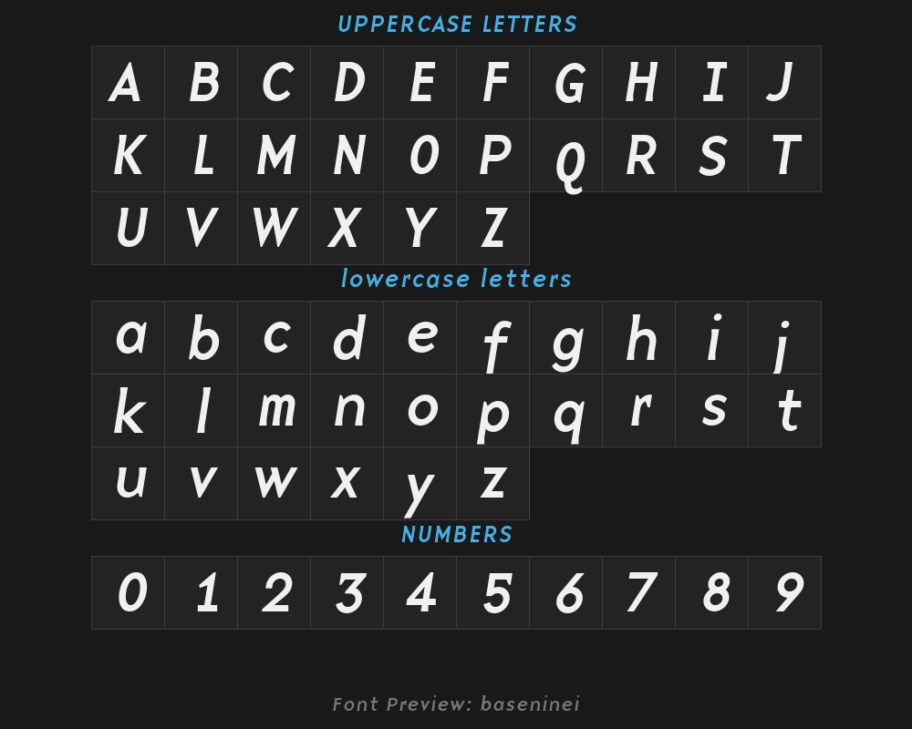 baseninei is a font file with a size of 0.04 MB. The full font name is BaseNineI, Version 1.00 version. It contains 217 characters, supports 8 Chinese characters. The copyright belongs to BaseNineI. baseninei font is available for free download, but commercial use requires confirmation on the BaseNineI official website whether it's free for commercial use.