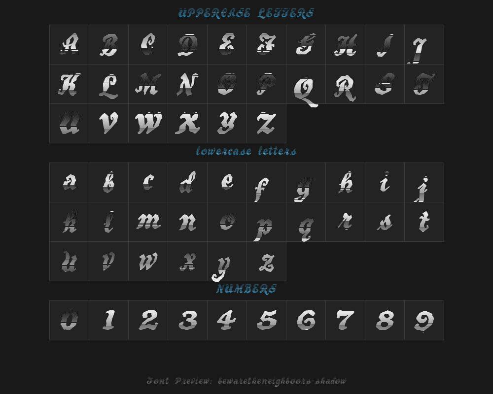 bewaretheneighboors-shadow is a font file with a size of 0.25 MB. The full font name is BewareTheNeighboors Shadow, Version 1.000 2010 initial release version. It contains 314 characters, supports 8 Chinese characters. The copyright belongs to BewareTheNeighboors Shadow. bewaretheneighboors-shadow font is available for free download, but commercial use requires confirmation on the BewareTheNeighboors Shadow official website whether it's free for commercial use.