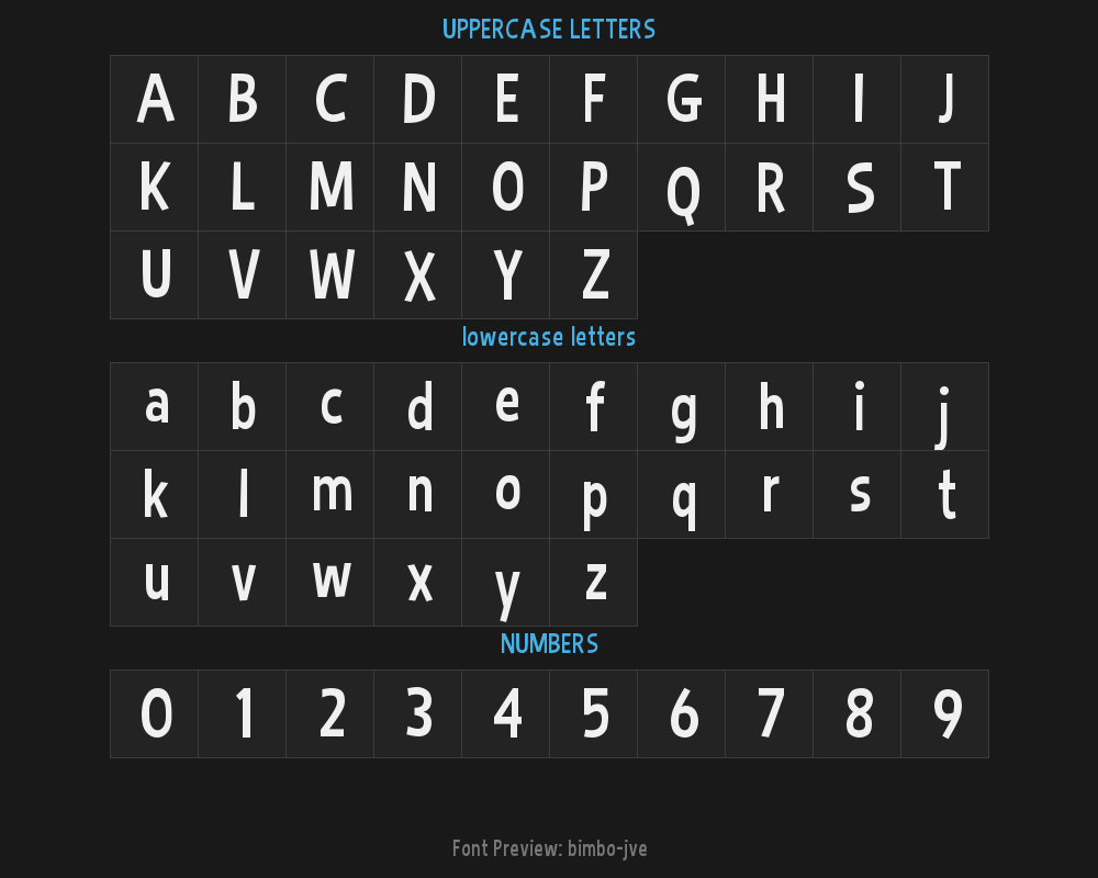 bimbo-jve is a font file with a size of 0.02 MB. The full font name is Bimbo JVE, Version 1.00 October 18, 2011, initial release version. It contains 189 characters, supports 8 Chinese characters. The copyright belongs to Bimbo JVE. bimbo-jve font is available for free download, but commercial use requires confirmation on the Bimbo JVE official website whether it's free for commercial use.
