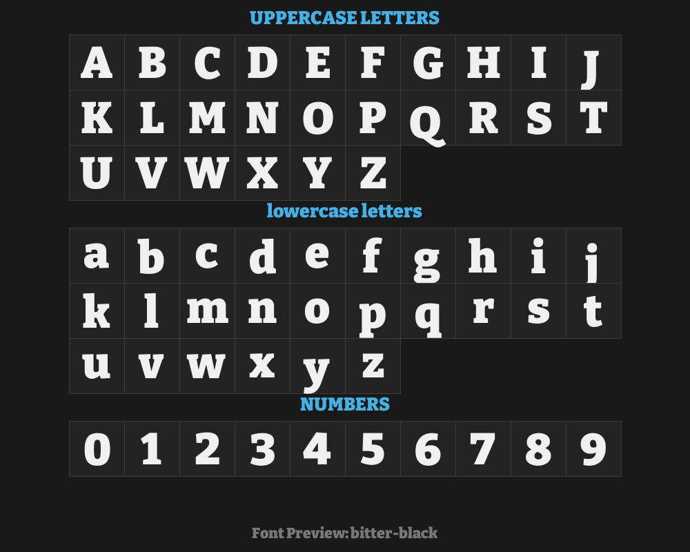 bitter-black is a font file with a size of 0.17 MB. The full font name is Bitter Black, Version 2.002 version. It contains 978 characters, supports 8 Chinese characters. The copyright belongs to Bitter Black. bitter-black font is available for free download, but commercial use requires confirmation on the Bitter Black official website whether it's free for commercial use.