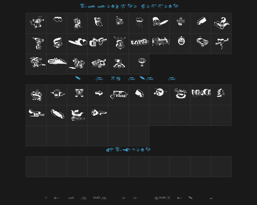 | Font description | German designer Roberto Mannella first sketched out the idea for Bobotta Icons during a vacation in 1999. Recently, he fleshed these sketches out into a full-fledged symbol font, which was awarded with an Honorable Mention in the 2003 International Type Design Contest, sponsored by Linotype GmbH. Bobotta Icons presents a lively, spontaneous style of drawing, guaranteed to bring a new voice to your funkiest typographic work. The characters contained in this font are a wide array of comic symbols, word shapes, and fantastical creatures. This font contains both symbols that resemble happy crocodiles, and symbols that resemble a neon sign flashing the word "love." |