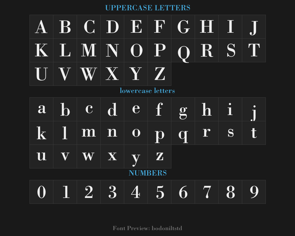 bodoniltstd is a font file with a size of 0.04 MB. The full font name is BodoniLTStd, Version 1.200;PS 001.002;hotconv 1.0.38 version. It contains 254 characters, supports 8 Chinese characters. The copyright belongs to Bodoni LT Std. bodoniltstd font is available for free download, but commercial use requires confirmation on the Bodoni LT Std official website whether it's free for commercial use.