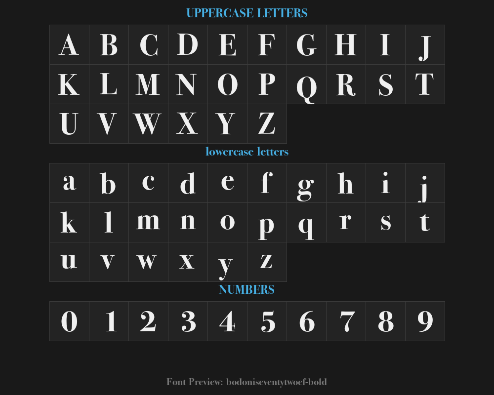 bodoniseventytwoef-bold is a font file with a size of 0.05 MB. The full font name is BodoniSeventytwoEF-Bold, 001.000 version. It contains 245 characters, supports 8 Chinese characters. The copyright belongs to BodoniSeventytwoEF. bodoniseventytwoef-bold font is available for free download, but commercial use requires confirmation on the BodoniSeventytwoEF official website whether it's free for commercial use.