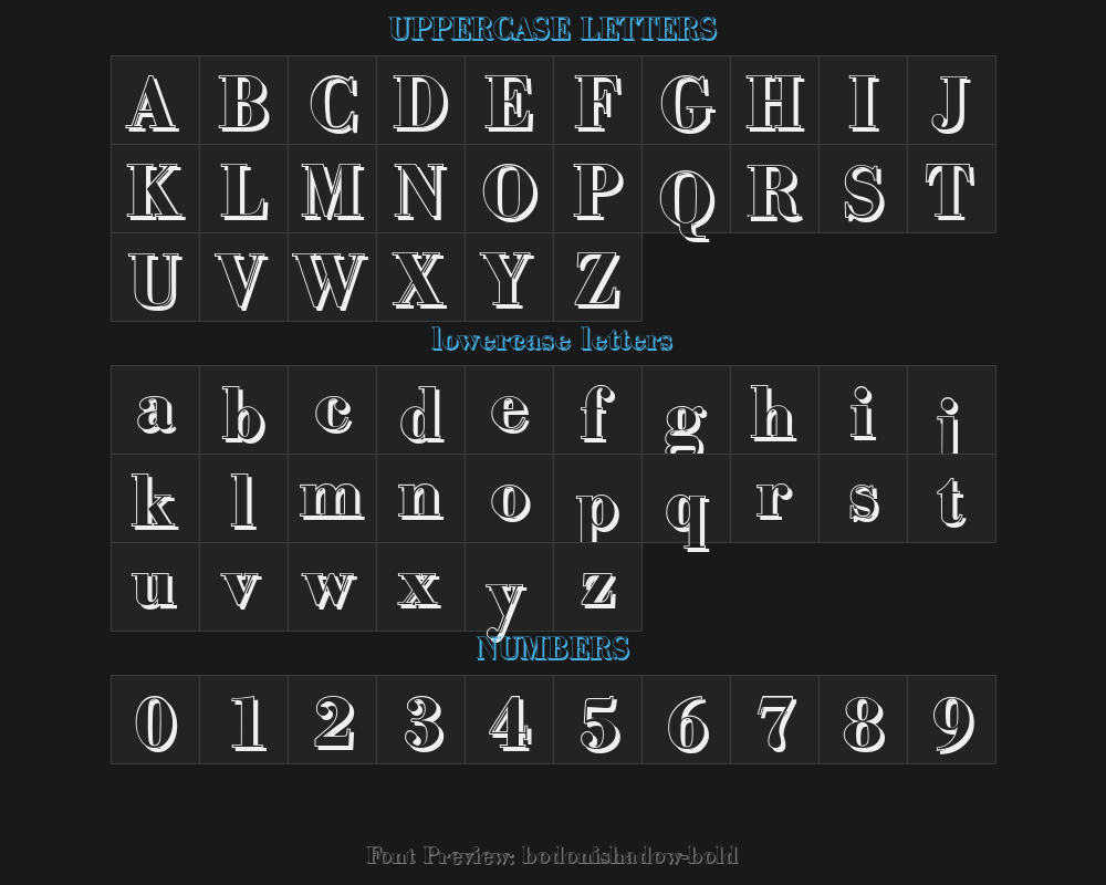 bodonishadow-bold is a font file with a size of 0.13 MB. The full font name is BodoniShadow-Bold, Version 1.0 27-08-2002 version. It contains 239 characters, supports 8 Chinese characters. The copyright belongs to BodoniShadow. bodonishadow-bold font is available for free download, but commercial use requires confirmation on the BodoniShadow official website whether it's free for commercial use.