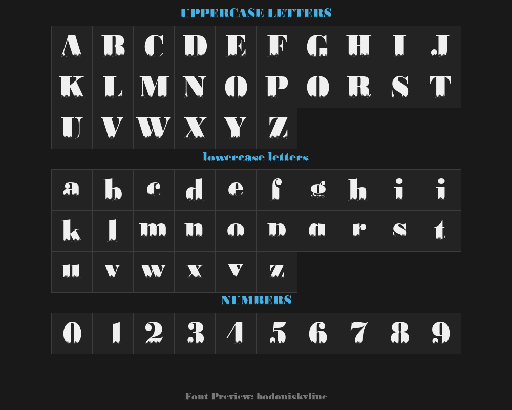 bodoniskyline is a font file with a size of 0.75 MB. The full font name is BodoniSkyline-Regular, Version 1.0 09-03-2003 version. It contains 306 characters, supports 8 Chinese characters. The copyright belongs to BodoniSkyline. bodoniskyline font is available for free download, but commercial use requires confirmation on the BodoniSkyline official website whether it's free for commercial use.
