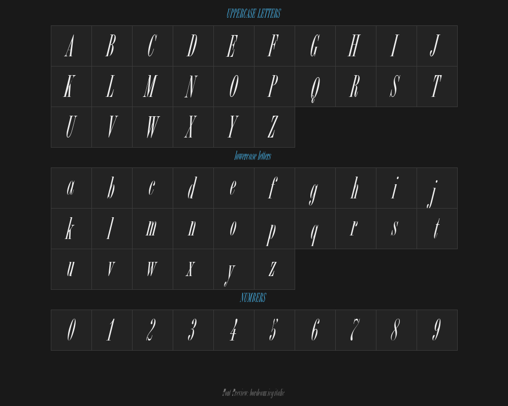 bordeaux-icg-italic is a font file with a size of 0.05 MB. The full font name is Bordeaux ICG Italic, Altsys Fontographer 4.1 19 08 1996 version. It contains 250 characters, supports 8 Chinese characters. The copyright belongs to Bordeaux ICG. bordeaux-icg-italic font is available for free download, but commercial use requires confirmation on the Bordeaux ICG official website whether it's free for commercial use.