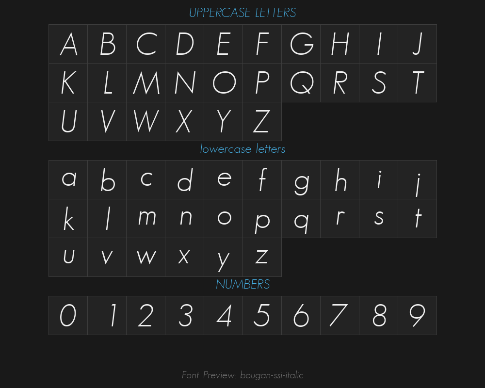bougan-ssi-italic is a font file with a size of 0.04 MB. The full font name is Bougan SSi Italic, 001.000 version. It contains 246 characters, supports 8 Chinese characters. The copyright belongs to Bougan SSi. bougan-ssi-italic font is available for free download, but commercial use requires confirmation on the Bougan SSi official website whether it's free for commercial use.