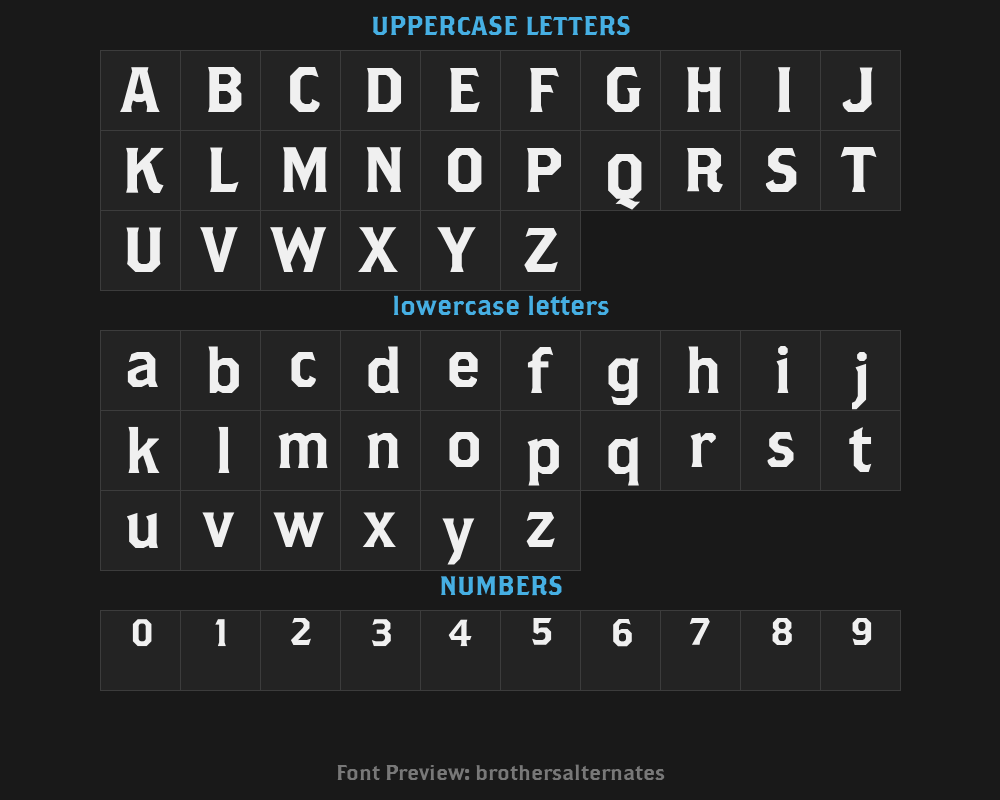 brothersalternates is a font file with a size of 0.04 MB. The full font name is BrothersAlternates, Version 1.00 version. It contains 217 characters, supports 8 Chinese characters. The copyright belongs to BrothersAlternates. brothersalternates font is available for free download, but commercial use requires confirmation on the BrothersAlternates official website whether it's free for commercial use.