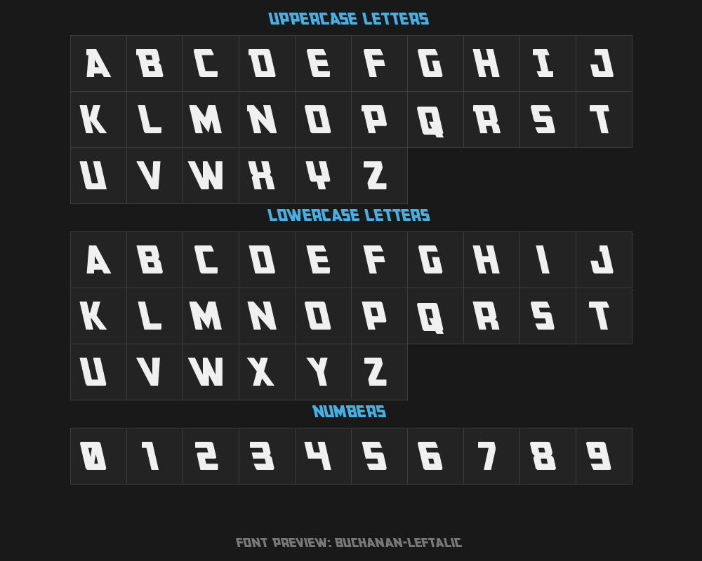 buchanan-leftalic is a font file with a size of 0.03 MB. The full font name is Buchanan Leftalic, Version 2.0; 2016 version. It contains 219 characters, supports 8 Chinese characters. The copyright belongs to Buchanan Leftalic. buchanan-leftalic font is available for free download, but commercial use requires confirmation on the Buchanan Leftalic official website whether it's free for commercial use.