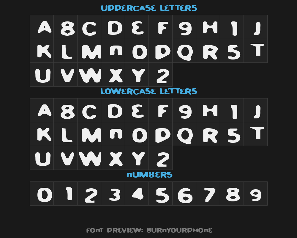 burnyourphone is a font file with a size of 0.05 MB. The full font name is BurnYourPhone, Macromedia Fontographer 4.1 1-11-97 version. It contains 109 characters, supports 8 Chinese characters. The copyright belongs to BurnYourPhone. burnyourphone font is available for free download, but commercial use requires confirmation on the BurnYourPhone official website whether it's free for commercial use.
