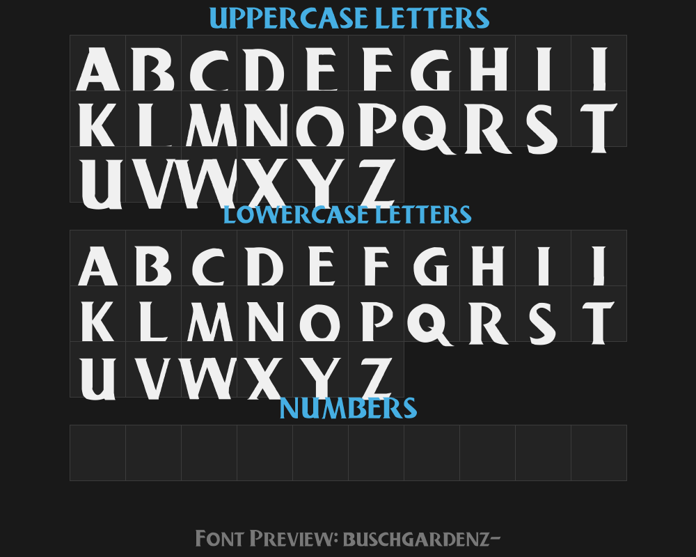buschgardenz- is a font file with a size of 0.02 MB. The full font name is BuschGardenz, www.sharkshock.uni.cc version. It contains 652 characters, supports 8 Chinese characters. The copyright belongs to BuschGardenz. buschgardenz- font is available for free download, but commercial use requires confirmation on the BuschGardenz official website whether it's free for commercial use.
