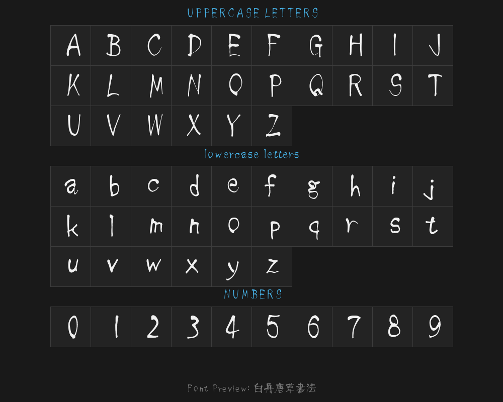 Bai Zhou Tang Cursive Calligraphy.ttf is a font file with a size of 6.72 MB. The full font name is KarakusaAA, Version 1.00 version. It contains 14963 characters, supports 12204 Chinese characters. The copyright belongs to Tangcao AA. Bai Zhou Tang Cursive Calligraphy.ttf font is available for free download, but commercial use requires confirmation on the Tangcao AA official website whether it's free for commercial use.