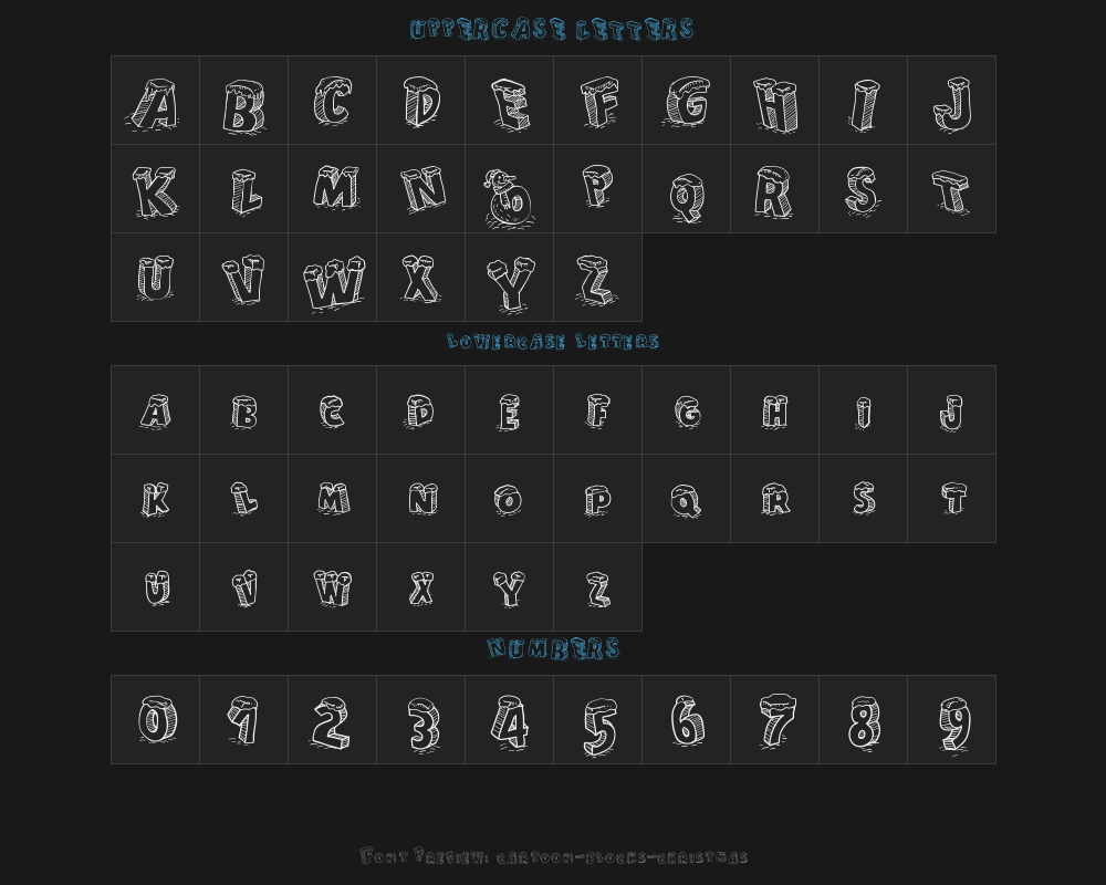 cartoon-blocks-christmas is a font file with a size of 0.48 MB. The full font name is Cartoon Blocks Christmas, Version 1.00 December 6, 2014, initial release version. It contains 240 characters, supports 8 Chinese characters. The copyright belongs to Cartoon Blocks Christmas. cartoon-blocks-christmas font is available for free download, but commercial use requires confirmation on the Cartoon Blocks Christmas official website whether it's free for commercial use.