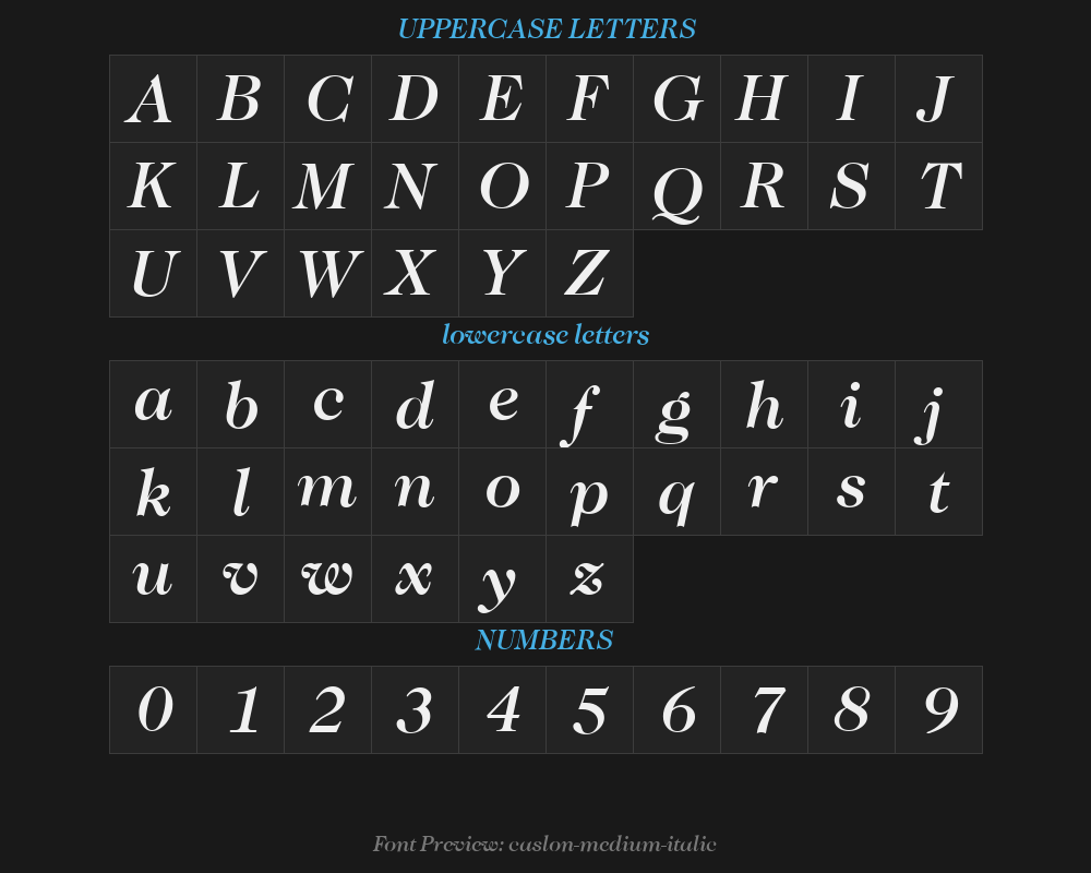 caslon-medium-italic is a font file with a size of 0.17 MB. The full font name is Caslon-Medium-Italic, Version 1.0 08-10-2002 version. It contains 474 characters, supports 8 Chinese characters. The copyright belongs to Caslon-Medium. caslon-medium-italic font is available for free download, but commercial use requires confirmation on the Caslon-Medium official website whether it's free for commercial use.