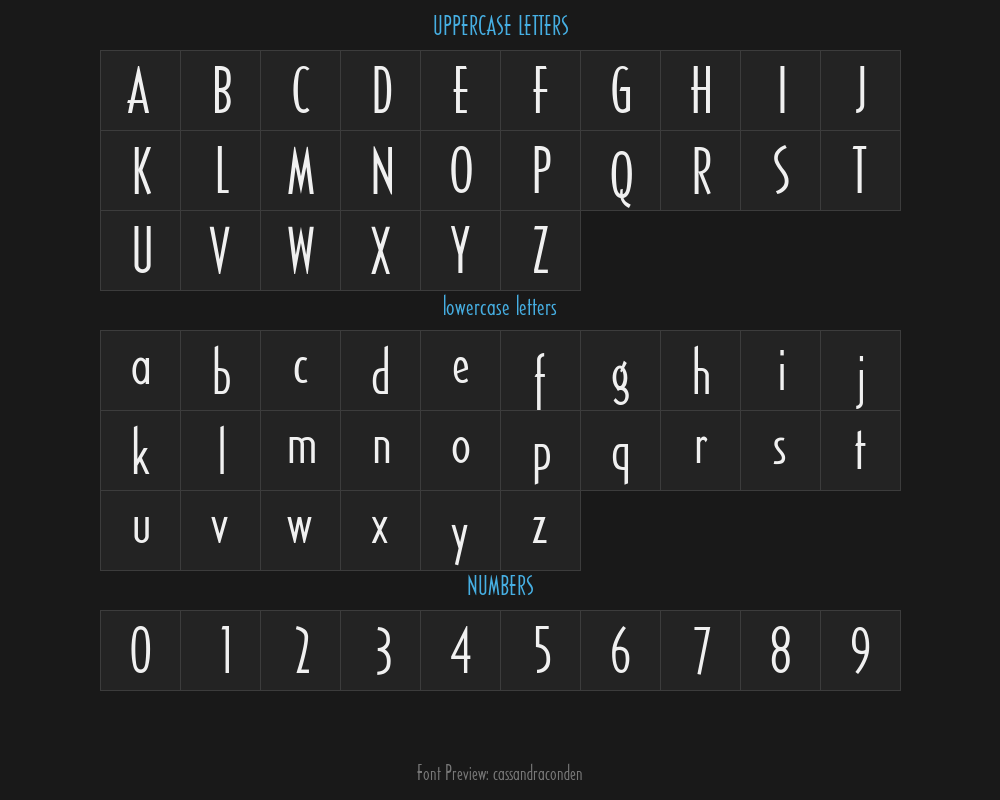 cassandraconden is a font file with a size of 0.02 MB. The full font name is CassandraConden, d aff09 CASSANDR.FF1 ---------- version. It contains 394 characters, supports 8 Chinese characters. The copyright belongs to CassandraConden. cassandraconden font is available for free download, but commercial use requires confirmation on the CassandraConden official website whether it's free for commercial use.