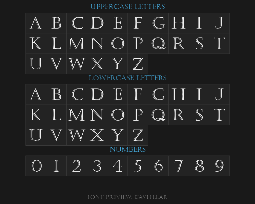 castellar is a font file with a size of 0.05 MB. The full font name is Castellar, Version 1.55 version. It contains 266 characters, supports 8 Chinese characters. The copyright belongs to Castellar. castellar font is available for free download, but commercial use requires confirmation on the Castellar official website whether it's free for commercial use.